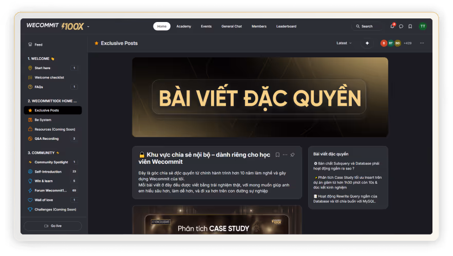 Đây là không gian để bạn kết nối, đào sâu và đi xa hơn. Một cộng đồng kín với forum, các bài viết đặc quyền (chứa mindmap tư duy trong dự án, video phân tích dự án, scripts áp dụng trong Production), các Video Spotlight chia sẻ hành trình thật của học viên (các khó khăn học đã gặp, cách họ đã xử lý, cách xây dựng vị trí vững chắc trong công ty …)